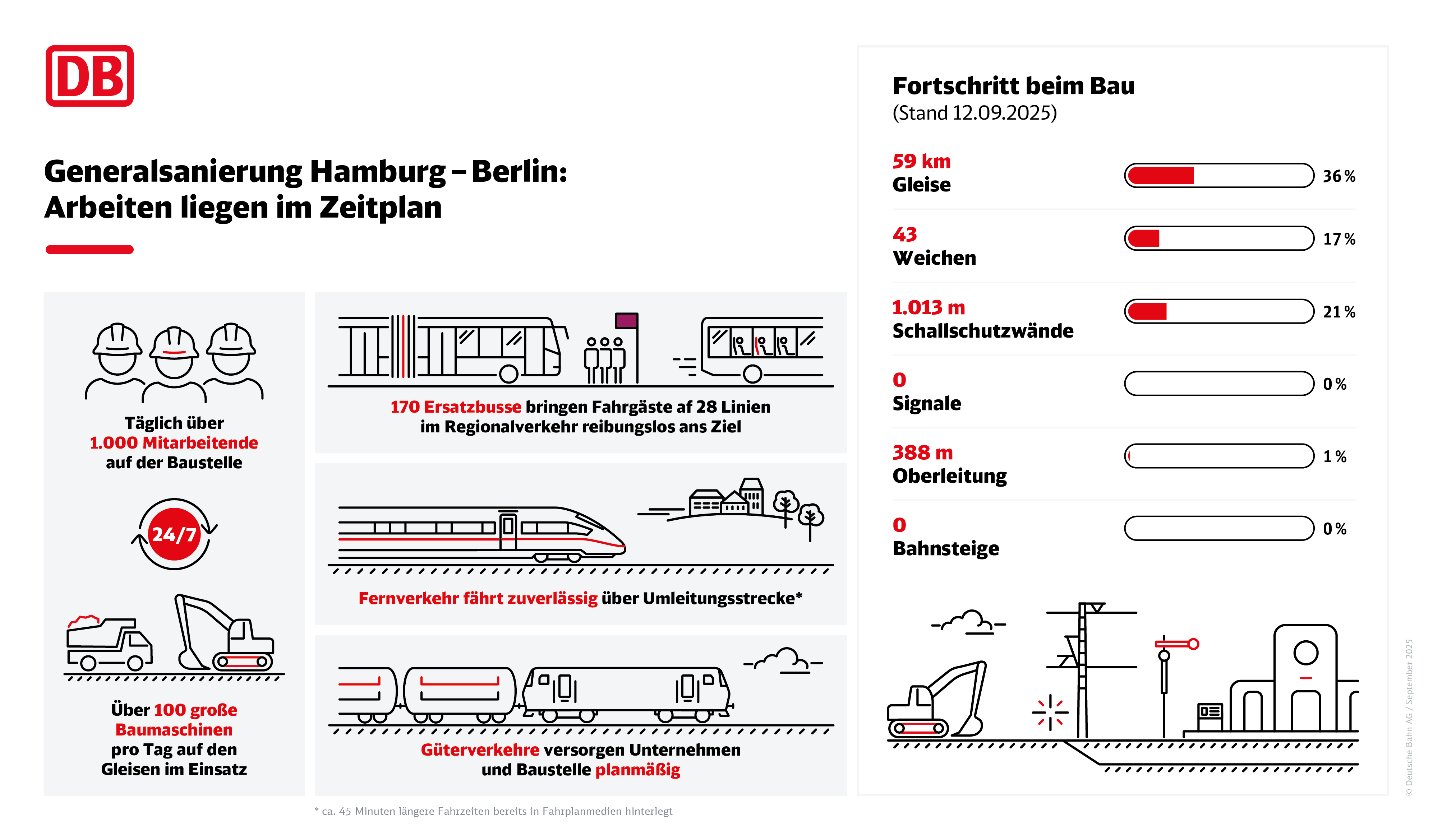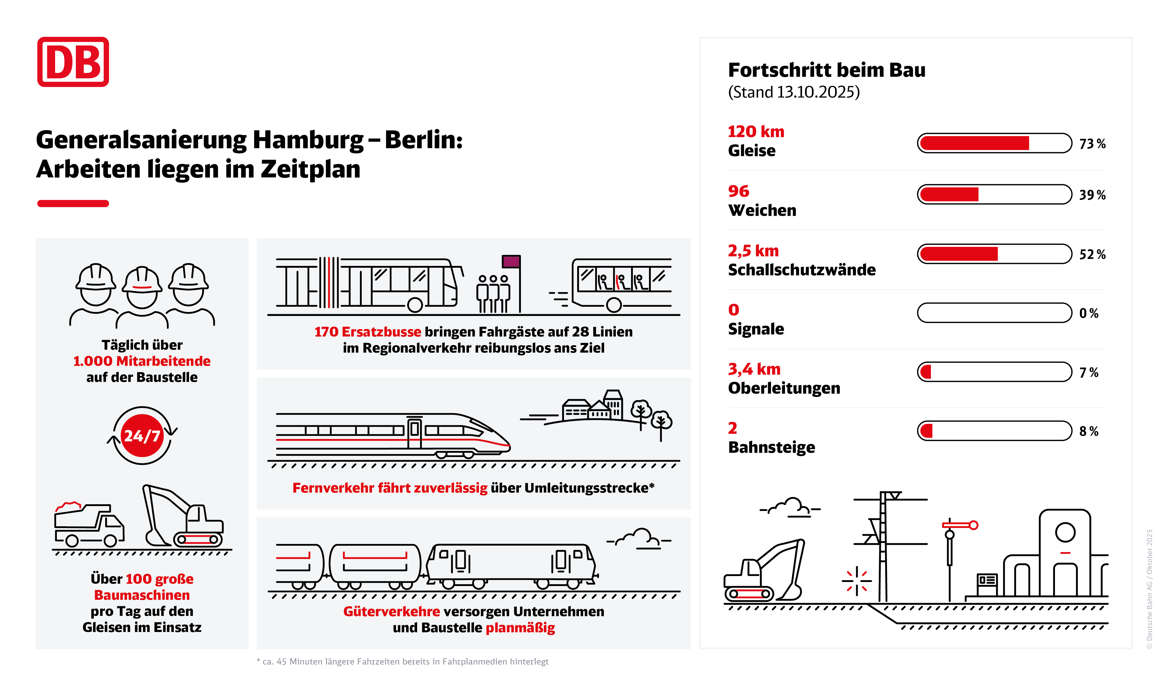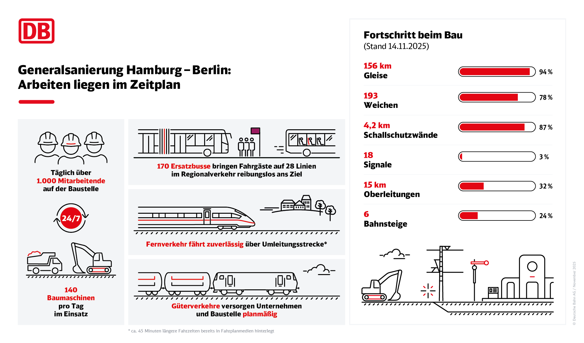 Die Generalsanierung der Bahnstrecke Hamburg–Berlin läuft bis zum 30. April 2026. Dann soll die Verbindung zwischen den beiden größten deutschen Städten mit allen erneuerten Anlagen wieder in Betrieb gehen.