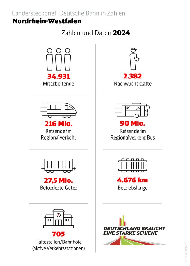 Die Deutsche Bahn (DB) beschäftigt in Nordrhein-Westfalen (NRW) mehr als 34.000 Mitarbeiterinnen und Mitarbeiter. Sie ist damit einer der größten Arbeitgeber im Land und sichert durch Aufträge und Effekte aus Einkommen allein bei den regionalen Unternehmen der Dienstleistungs- und Zulieferindustrie tausende weitere Arbeitsplätze.