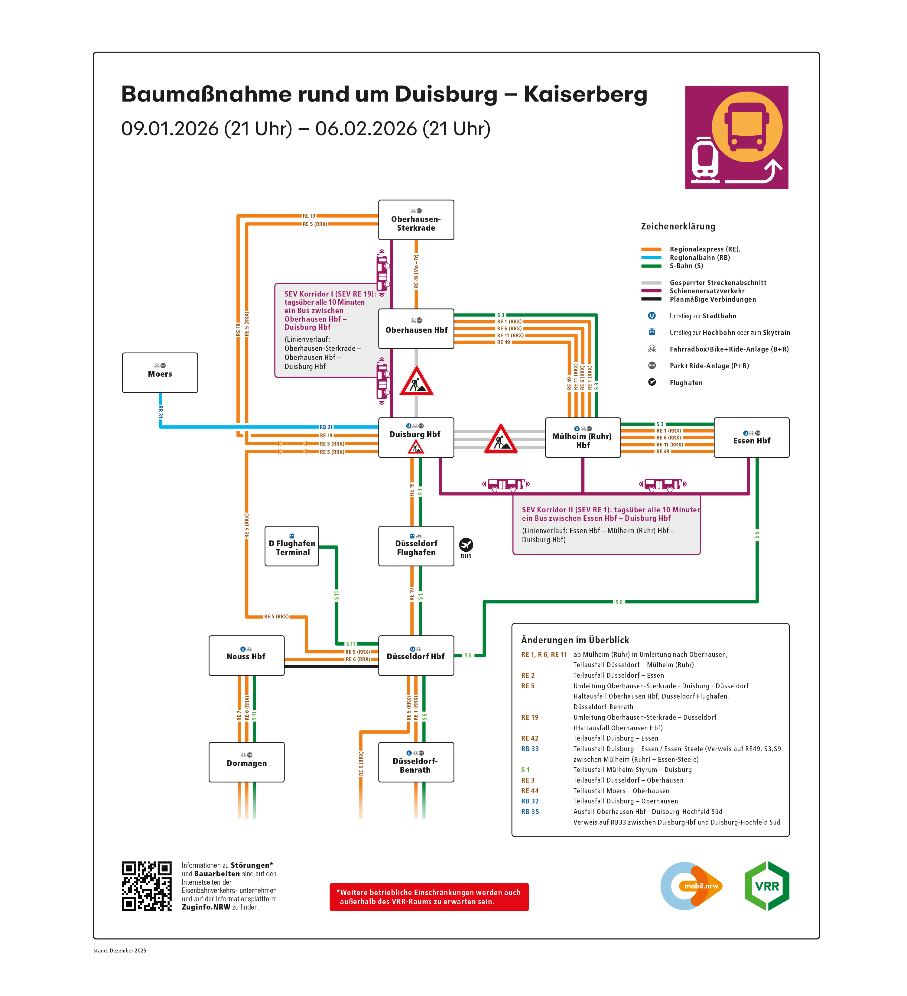 - RE 1 (RRX, NationalExpress): Umleitung ab Mülheim (Ruhr) Hbf nach Oberhausen Hbf, Ausfall zwischen Oberhausen Hbf und Düsseldorf Hbf