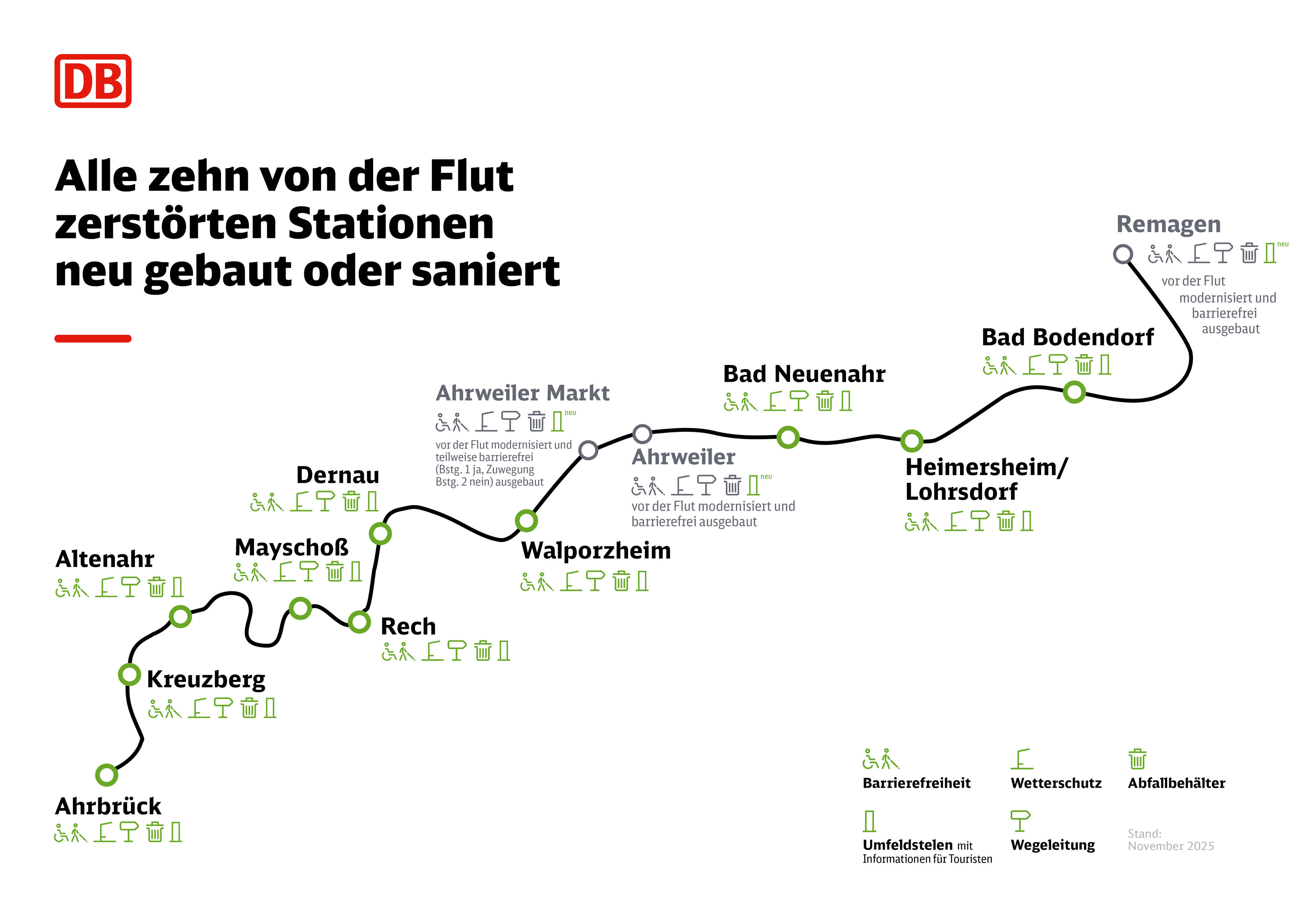 Damit die Reisenden an modernen Stationen ein- und aussteigen können, hat die DB alle zehn von der Flut zerstörten Stationen neu gebaut oder umfangreich saniert. Zudem sind die insgesamt 13 Stationen entlang der Bahnlinie von Remagen bis Ahrbrück Mitte Dezember bis auf Bahnsteig 2 in Ahrweiler-Markt vollständig barrierefrei. Dank weiterer Verbesserungen wie Wetterschutzhäusern, modernen dynamischen Schriftanzeigern und neuer Wegeleitung profitieren die Kundinnen und Kunden ab Fahrplanwechsel insgesamt von höherem Komfort und mehr Aufenthaltsqualität.