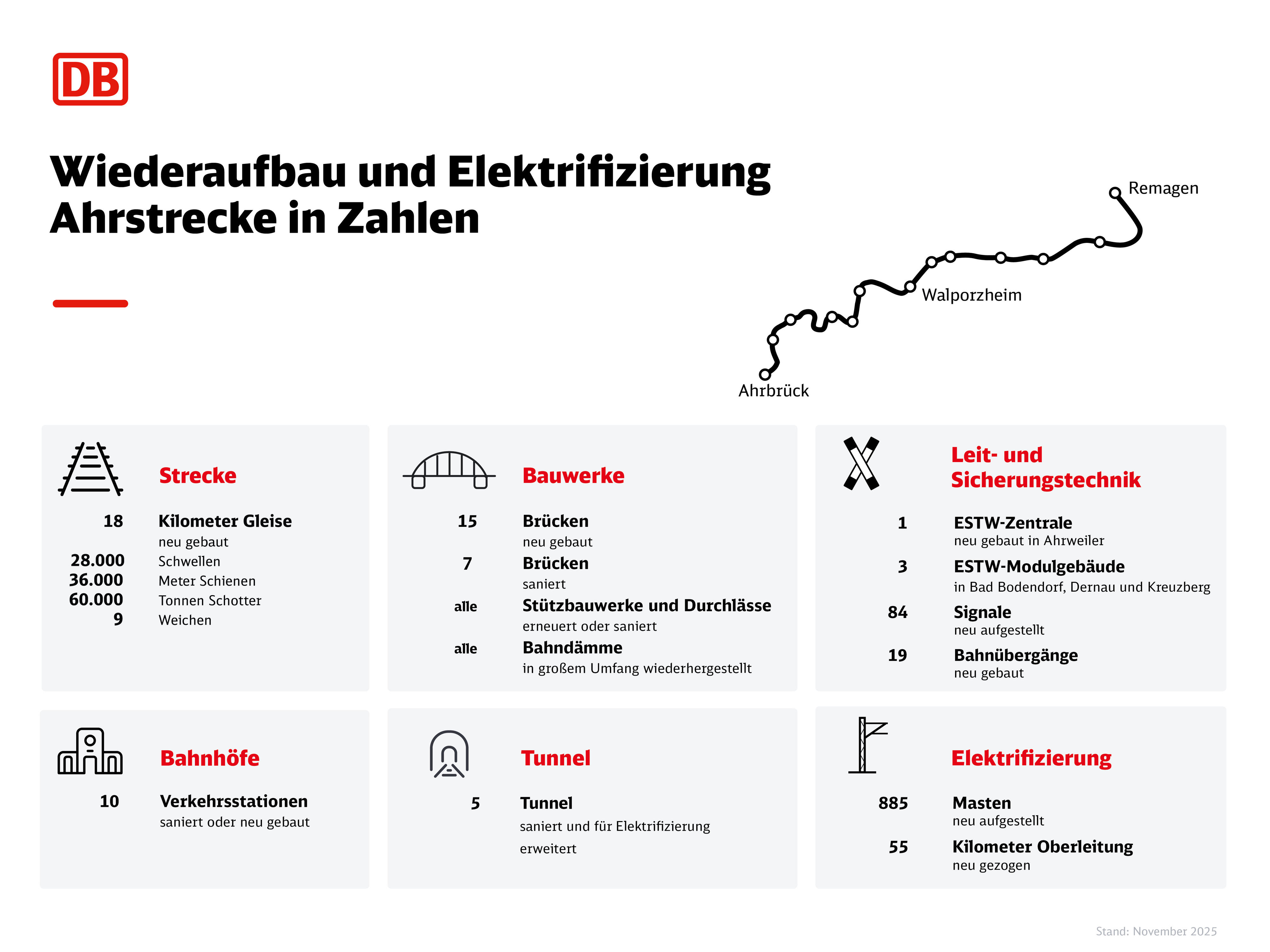 Regionalbahnen fahren ab Sonntag wieder zwischen Remagen und Ahrbrück • Wiederaufbau der Infrastruktur in Rekordzeit umgesetzt • 18 Kilometer Gleise, 22 Brücken, fünf Tunnel und zehn Stationen im vorgesehenen Zeitplan wiederhergestellt • Moderne Stellwerkstechnik installiert und Strecke elektrifiziert • Schulterschluss von DB, Politik, Gemeinden und Aufgabenträgern