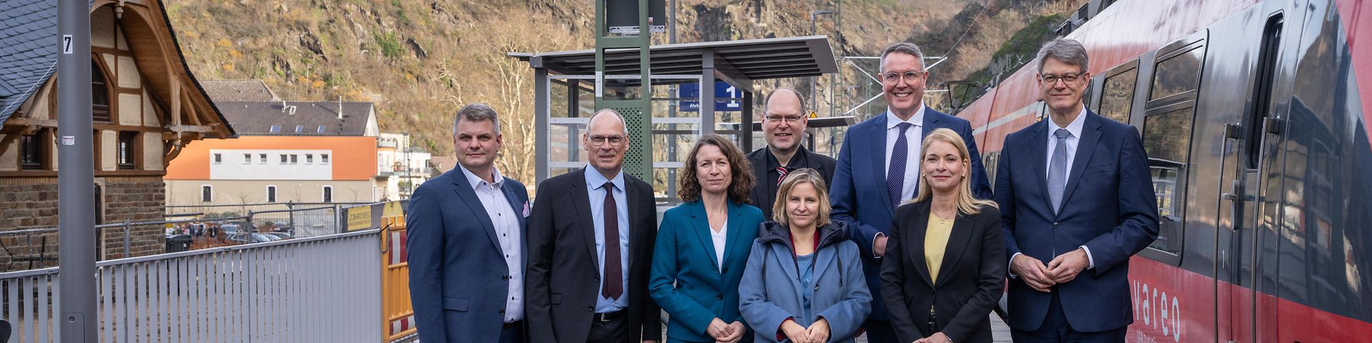 Im Bild v.l.n.r.: Stefan Gleißner, Leiter Technik Portfolio Mainz / Koblenz DB InfraGo AG Gerd-Dietrich Bolte, Leiter Infrastrukturprojekte Region Mitte, DB InfraGo AG Cornelia Weigand, Landrätin des Landkreises Ahrweiler Thorsten Müller, Verbandsdirektor Zweckverband SchienenPersonenNahVerkehr Rheinland-Pfalz Nord (SPNV Nord) Katrin Eder, Ministerin für Klimaschutz, Umwelt, Energie und Mobilität Rheinland-Pfalz Alexander Schweitzer, Ministerpräsident des Landes Rheinland-Pfalz Evelyn Palla, Vorsitzende des Vorstands Deutsche Bahn AG Patrick Schnieder, Bundesminister für Verkehr