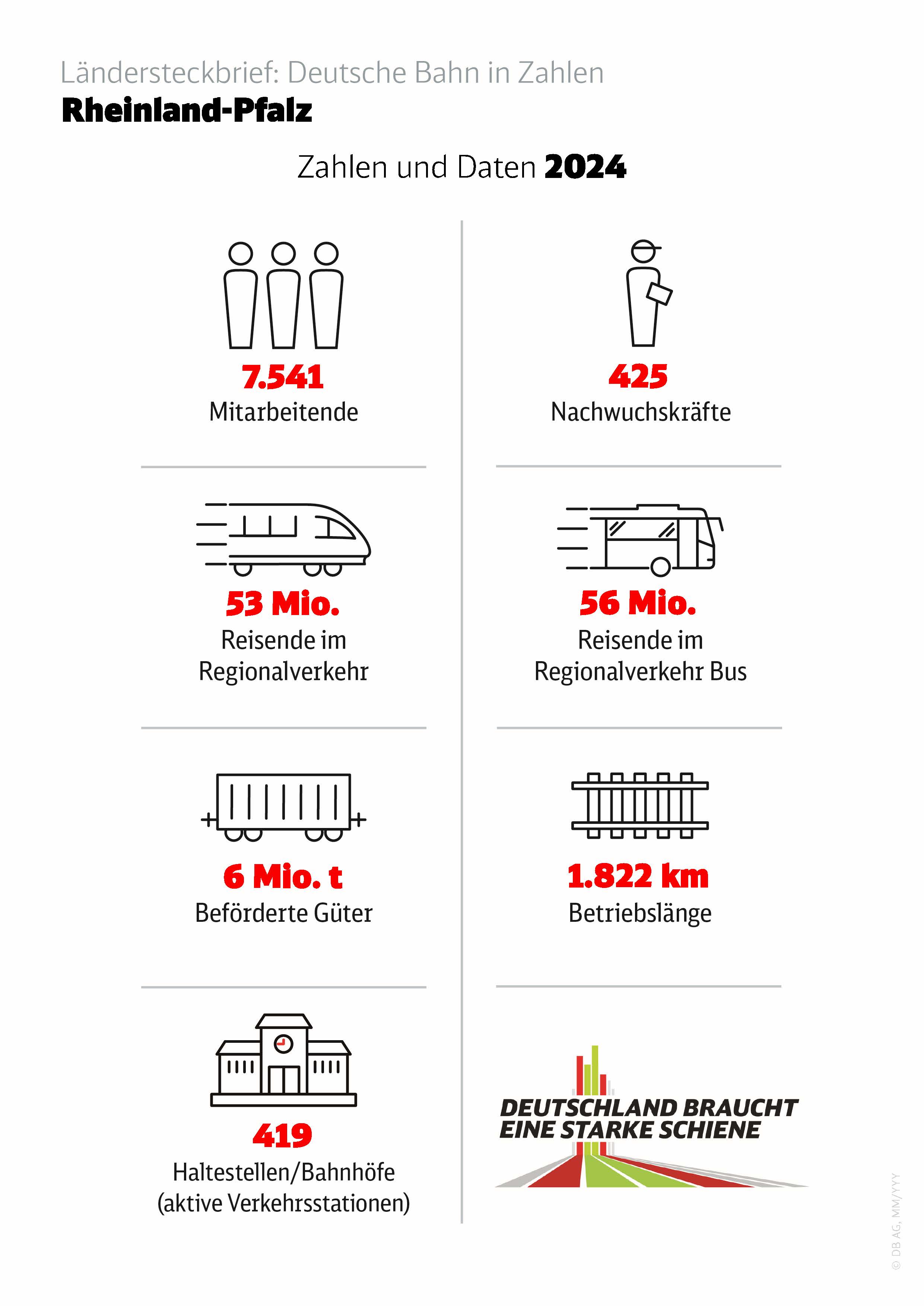 Die Deutsche Bahn beschäftigt in Rheinland-Pfalz über 7.500 Mitarbeitende. Der Konzern ist damit einer der größten Arbeitgeber im Land und sichert hier durch Aufträge und Effekte aus Einkommen allein bei den regionalen Unternehmen der Dienstleistungs- und Zulieferindustrie tausende weitere Arbeitsplätze.