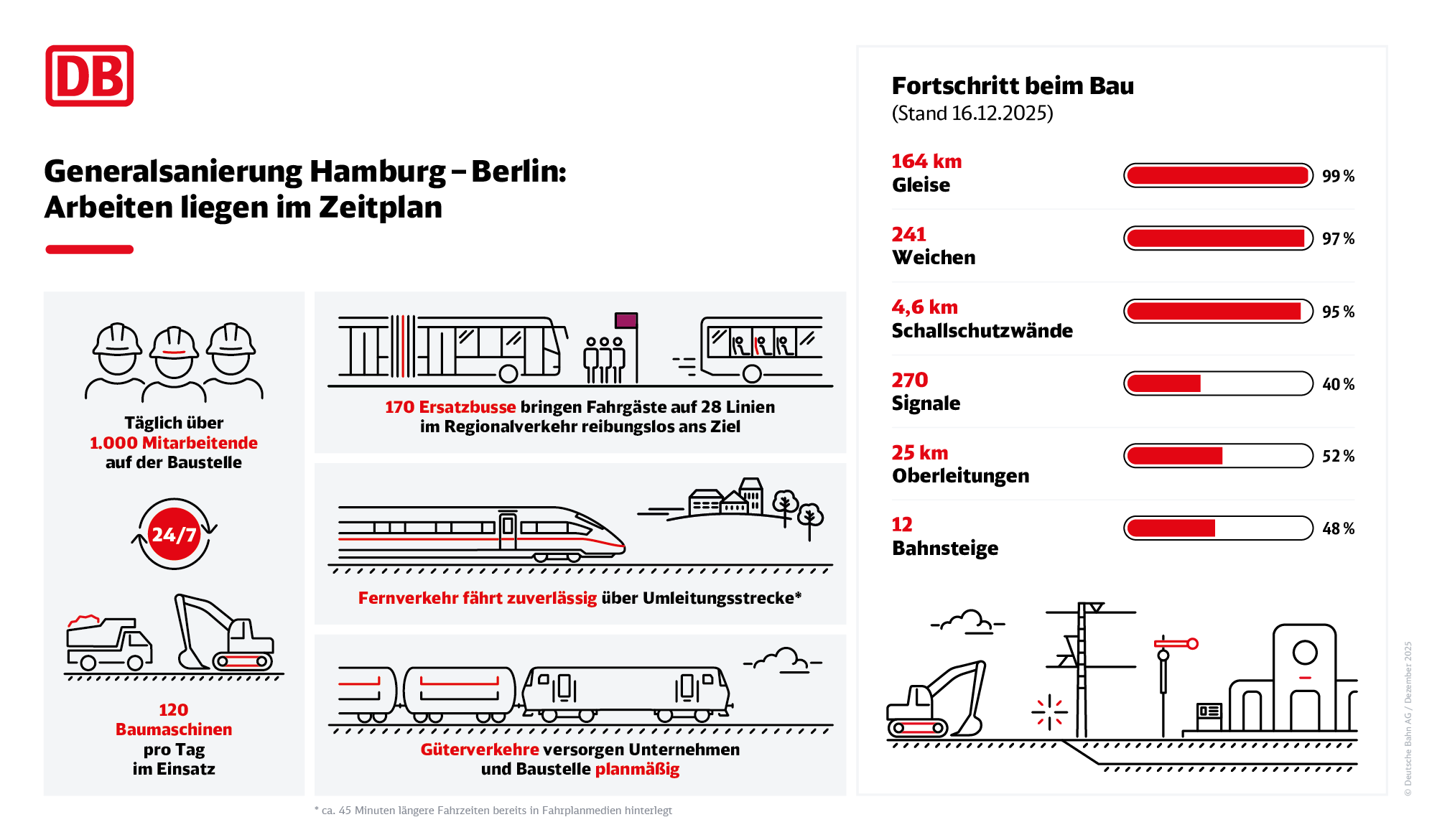 Rund fünf Monate nach dem Start der Generalsanierung auf der Bahnstrecke Hamburg–Berlin steht die erste Bauphase planmäßig vor dem Abschluss. Mehr als 1.000 Mitarbeitende der DB InfraGO und der beteiligten Bauunternehmen haben seit dem 1. August mit bis zu 140 Baumaschinen vor allem den sogenannten Oberbau erneuert: 164 km Gleise, 241 Weichen, fünf Kilometer Schallschutzwände, 270 Signale, 25 Kilometer Oberleitung und zwölf Bahnsteige. Damit ist das geplante Bausoll für den Oberbau bereits erfüllt. Für mehr Flexibilität im Betrieb sowie alternative Fahrtmöglichkeiten bei Störungen, hat die DB InfraGO außerdem neue Weichenverbindungen und Überleitstellen gebaut und die Oberleitungen entsprechend angepasst. In der nächsten Bauphase steht nun neben den Bahnhöfen die Signal- und Stellwerkstechnik im Fokus.