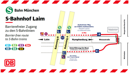 Die DB weist Fahrgäste daraufhin, dass in der UVR noch kein Treppenaufgang vorhanden ist. Beide Bahnsteige – A (stadtauswärts) und B (stadteinwärts) – sind aber wie gewohnt über die Treppenhäuser in der Laimer Fußgängerunterführung erreichbar. Fahrgäste werden vor Ort mit Schildern über die Wegeführung informiert.