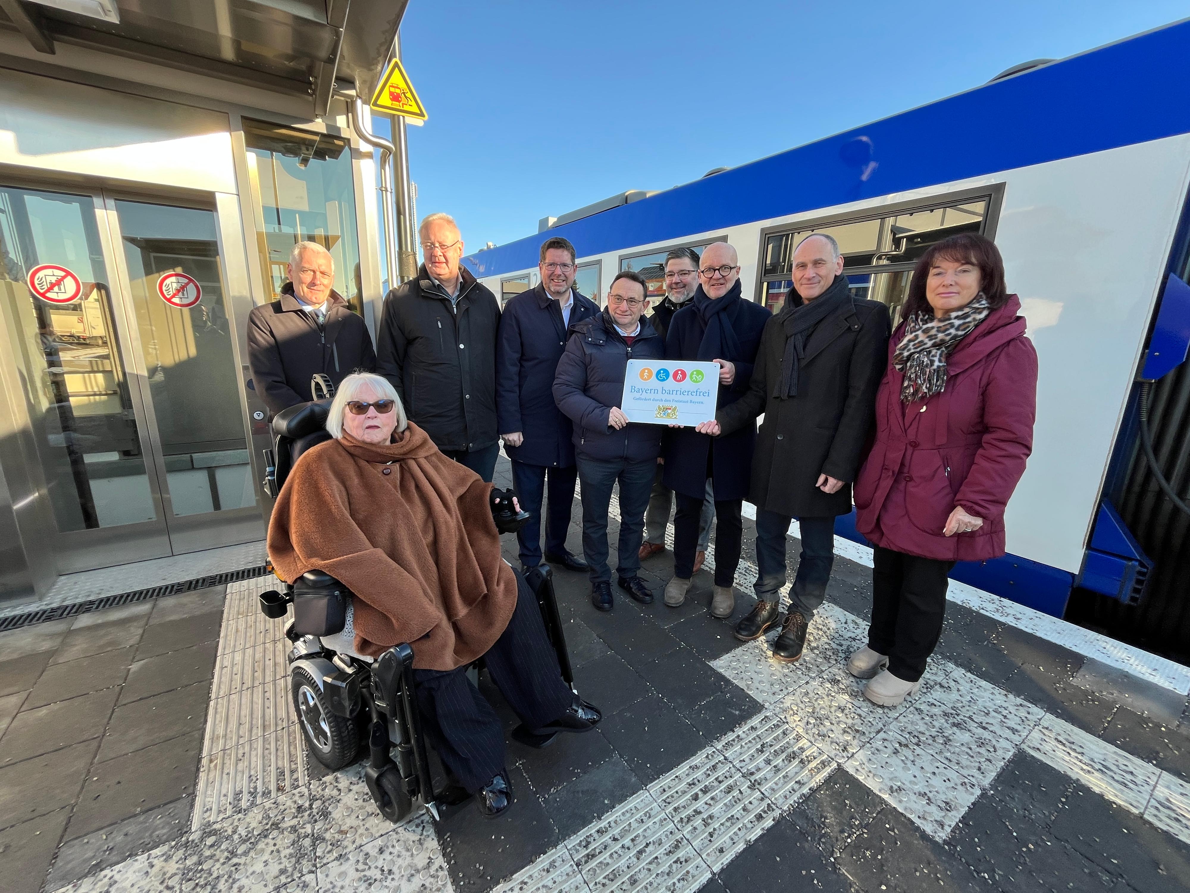 Eröffneten symbolischen den barrierefrei ausgebauten Bahnhof Marktoberdorf (von hinten links.): Dr. Thomas Gruber (Amtschef des Bayerischen Staatsministeriums für Wohnen, Bau und Verkehr), Bernhard Pohl (Mitglied des Bayerischen Landtags), Stephan Stracke (Mitglied des Bundestages), Ulrich Lange (Parlamentarischer Staatssekretär beim Bundesminister für Verkehr), Andreas Kaufmann (Mitglied des Bayerischen Landtags), Heiko Büttner (DB-Konzernbevollmächtigter für den Freistaat Bayern), Dr. Wolfgang Hell (Erster Bürgermeister der Stadt Marktoberdorf), Maria Rita Zinnecker (Landrätin Ostallgäu) sowie Waltraud Joa (vorne, Behindertenbeauftragte der Stadt Marktoberdorf).