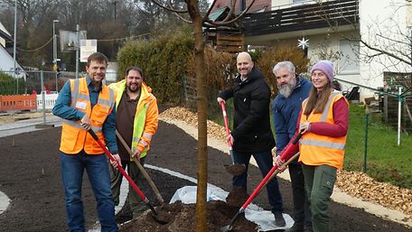 Die Arbeiten der Deutschen Bahn (DB) zur Neugestaltung der Grünanlage „Kusterdinger Straße“ in Wannweil schreiten voran: Nach Abschluss der Erd- und Pflasterarbeiten pflanzten heute Dr. Christian Majer, Bürgermeister der Gemeinde Wannweil, Carsten Göhner, Wannweils Ortsbaumeister, und Karl Pietzsch, Projektleiter bei der DB, gemeinsam den ersten Baum. Während der Erneuerung der benachbarten Eisenbahnbrücke nutzte die DB die gemeindeeigene Grünfläche als Baustellenfläche. Insgesamt investiert die DB rund 334.000 Euro in die neue Grünanlage.