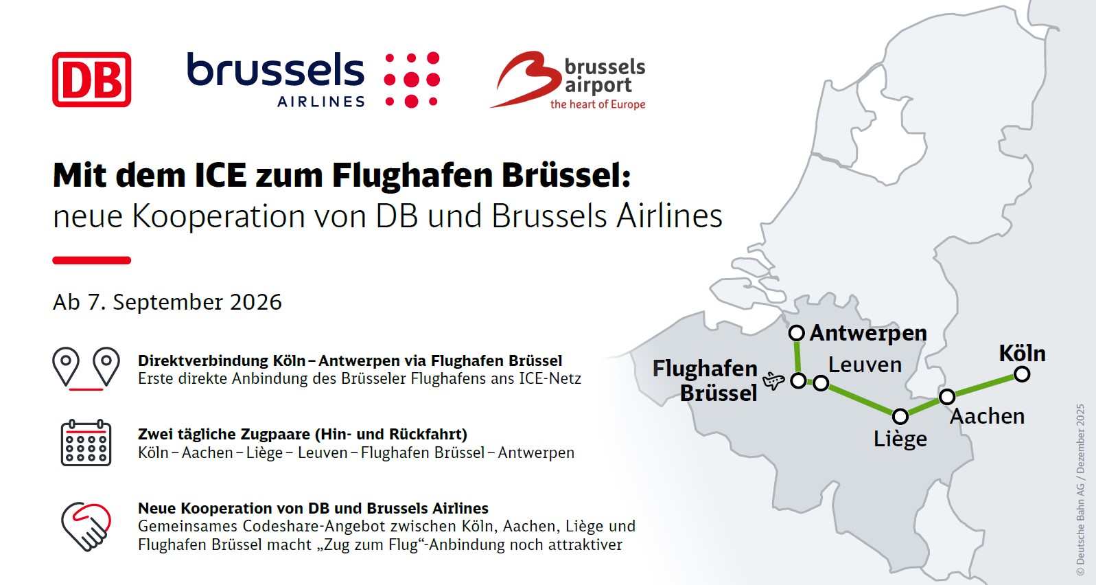 Der Brüsseler Flughafen erhält erstmals einen direkten Anschluss an das ICE-Netz: Die Deutsche Bahn (DB) und Brussels Airlines bieten künftig eine einfache und komfortable An- und Abreise zum und vom Brüsseler Flughafen an. Mit einem gemeinsamen Codeshare-Angebot können Reisende in nur einem Buchungsschritt ein kombiniertes Ticket für Zug und Flug erwerben. Möglich wird die Kooperation durch die neue ICE-Direktverbindung Köln–Antwerpen über Aachen, Liège, Leuven und den Brüsseler Flughafen, die am 7. September 2026 in Betrieb geht: Zwei tägliche Zugpaare (Hin- und Rückfahrt) werden ab bzw. bis Köln Hauptbahnhof zum bzw. vom Brüsseler Flughafen und von dort weiter bis Antwerpen verkehren. Fahrkarten für die ICE-Züge zum Flughafen Brüssel sind ab sofort buchbar.