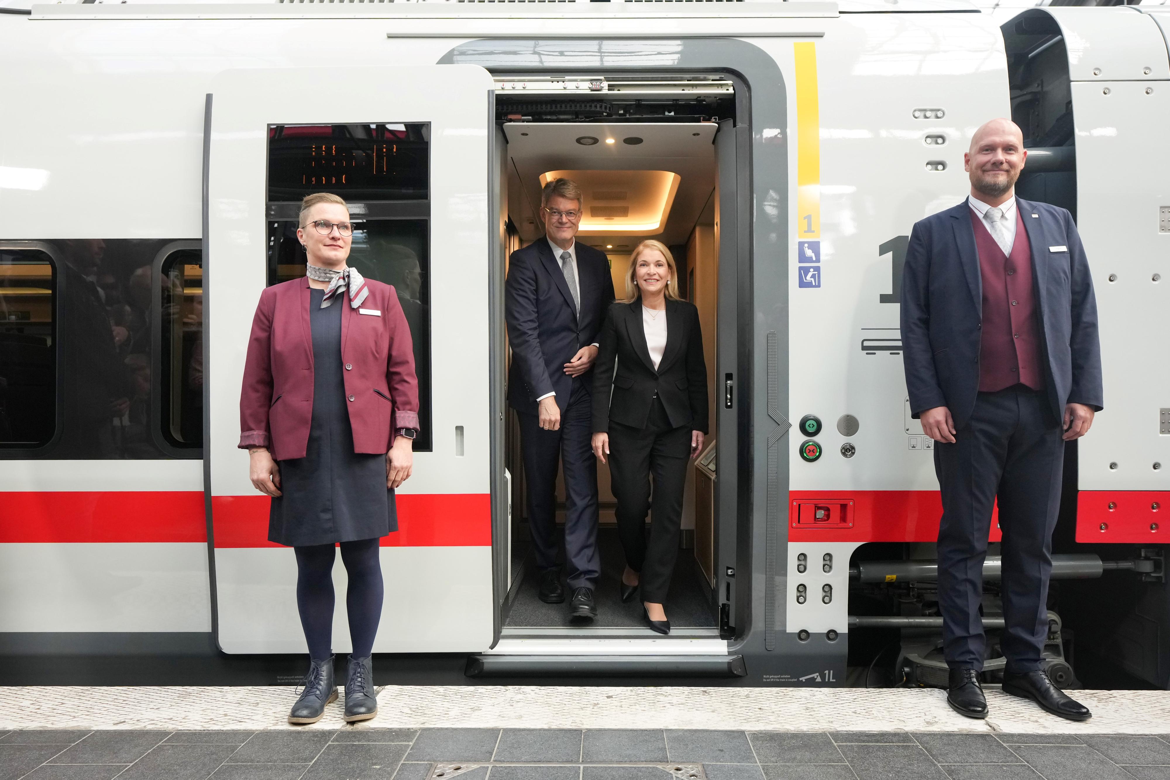 Evelyn Palla, Vorstandsvorsitzende der DB AG, Dr. Michael Peterson, DB-Vorstand Personenfernverkehr, Patrick Schnieder, Bundesminister für Verkehr, und Carlos de Palacio y Oriol, Executive Chairman des spanischen Herstellers Talgo, stellten den neuen ICE L heute in Berlin Ostbahnhof der Öffentlichkeit vor.