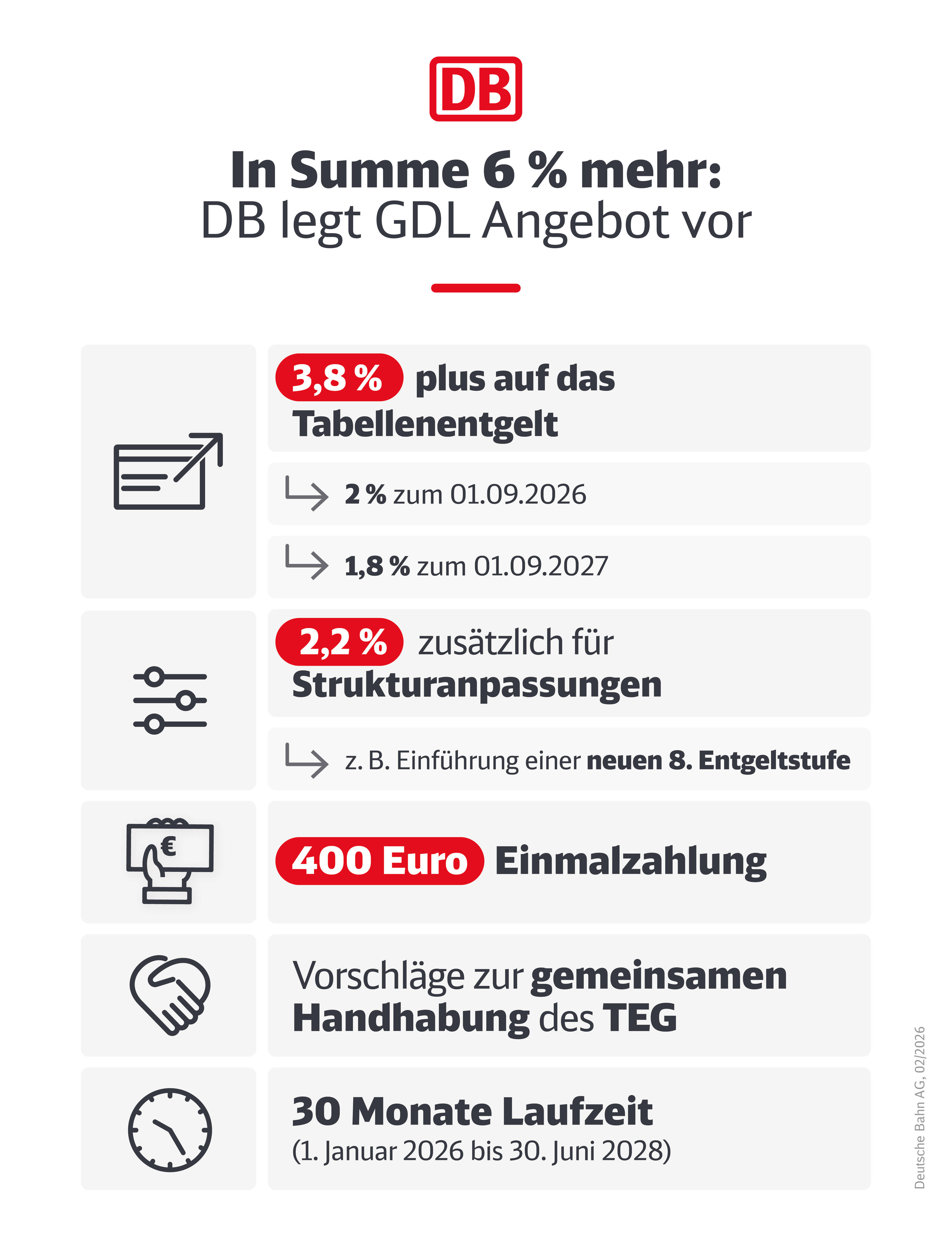 Pressemitteilung DB AG, vierter Termin am 10. FebruarIn Summe 6 Prozent mehr: Deutsche Bahn legt GDL erstes Angebot vor
